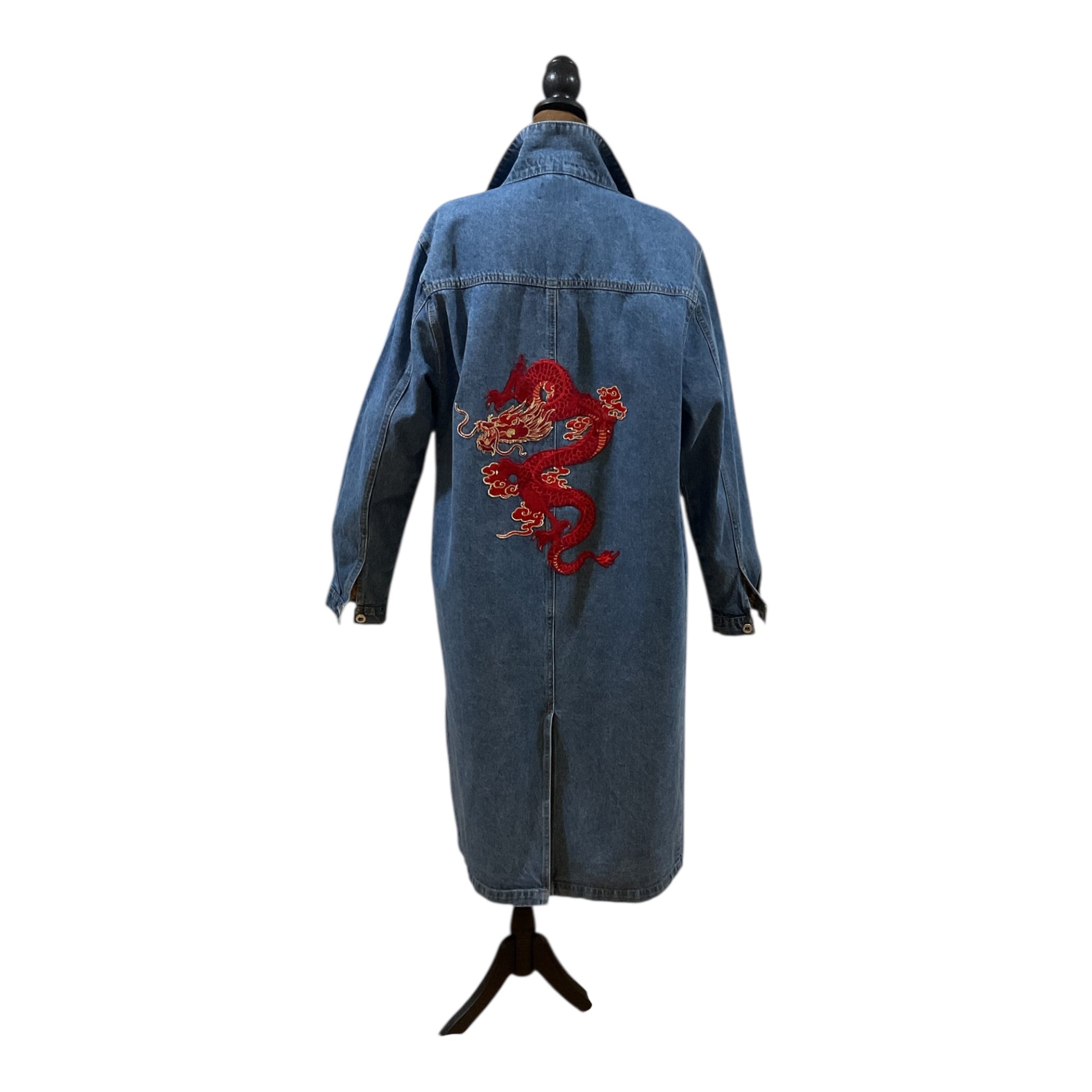Elevate your wardrobe with this timeless denim duster, featuring a gorgeous Red Dragon on the back. Designed for both style and comfort, this versatile piece offers a flattering silhouette with a relaxed drape that moves beautifully while expressing your love for the red dragon.